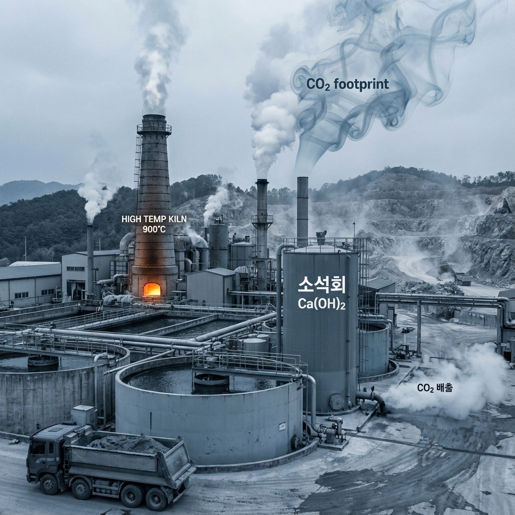 대부분의 산업체는 불소·인·황 제거를 위해 **소석회(Ca(OH)₂)**를 사용합니다. 하지만 소석회 생산 과정에서 막대한 CO₂가 배출됩니다.