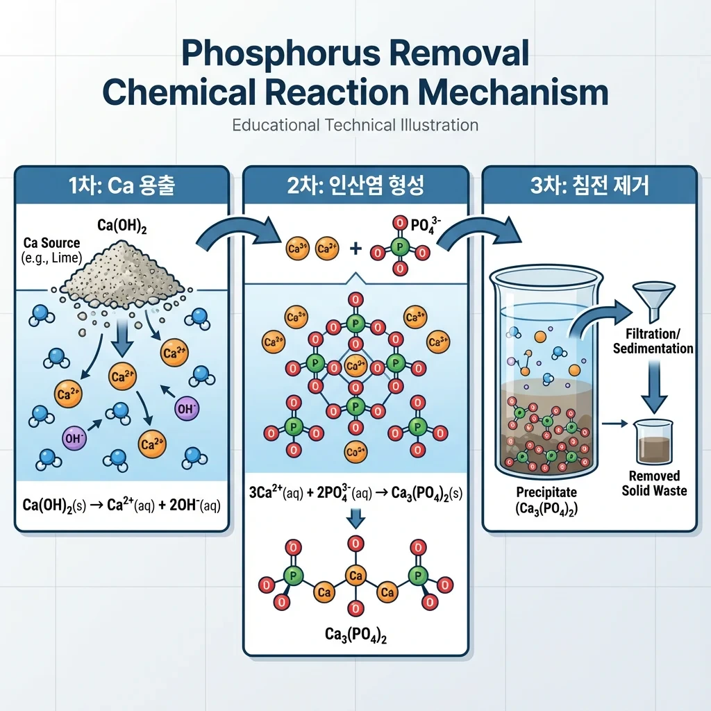 패각(CaCO₃)은 인산염(PO₄³⁻)과 반응하여 인산칼슘(Ca₃(PO₄)₂) 침전을 형성합니다. 이 과정은 3단계로 진행됩니다.