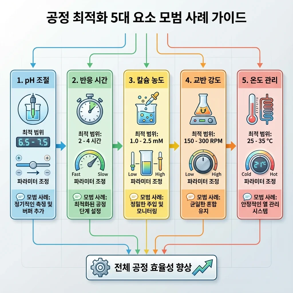 적절한 교반은 칼슘 용출을 촉진하고 침전 입자의 응집을 돕습니다. 너무 강하면(150rpm 이상) 생성된 침전이 파쇄되어 재부유하고, 너무 약하면(50rpm 이하) 반응이 느려집니다.