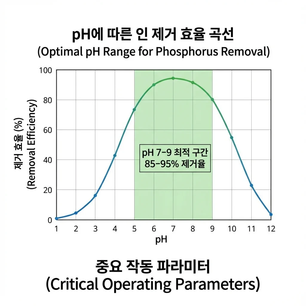 pH 7~9 (최적): 인산 이온 형태가 PO₄³⁻와 HPO₄²⁻로 균형을 이루며 Ca₃(PO₄)₂와 CaHPO₄ 침전이 모두 안정적으로 형성. 제거율 85~95%.