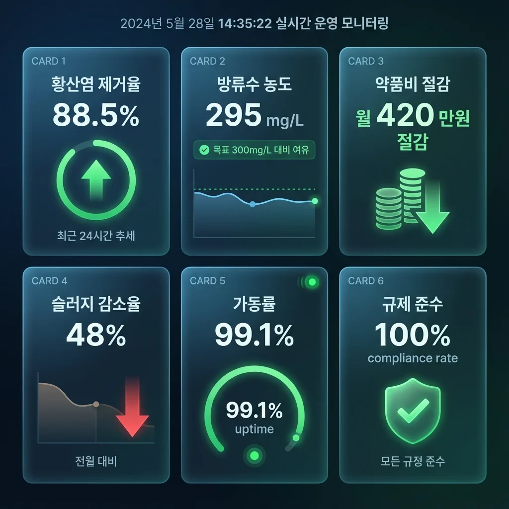 - 슬러지 감소율: 48% (처리 비용 연 5,760만 원 절감)