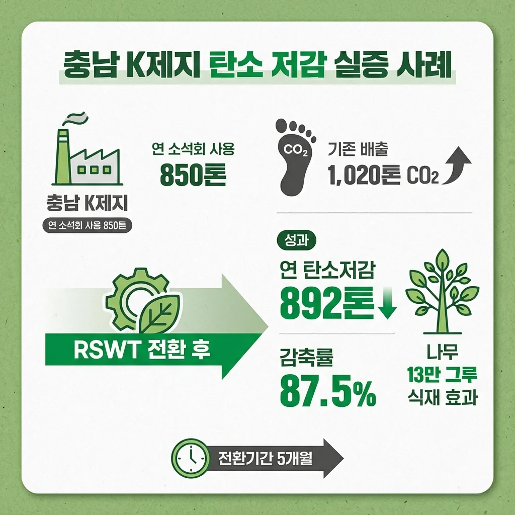충남 K제지(연 소석회 사용 850톤)는 RSWT로 전환하여 놀라운 탄소저감 성과를 달성했습니다.