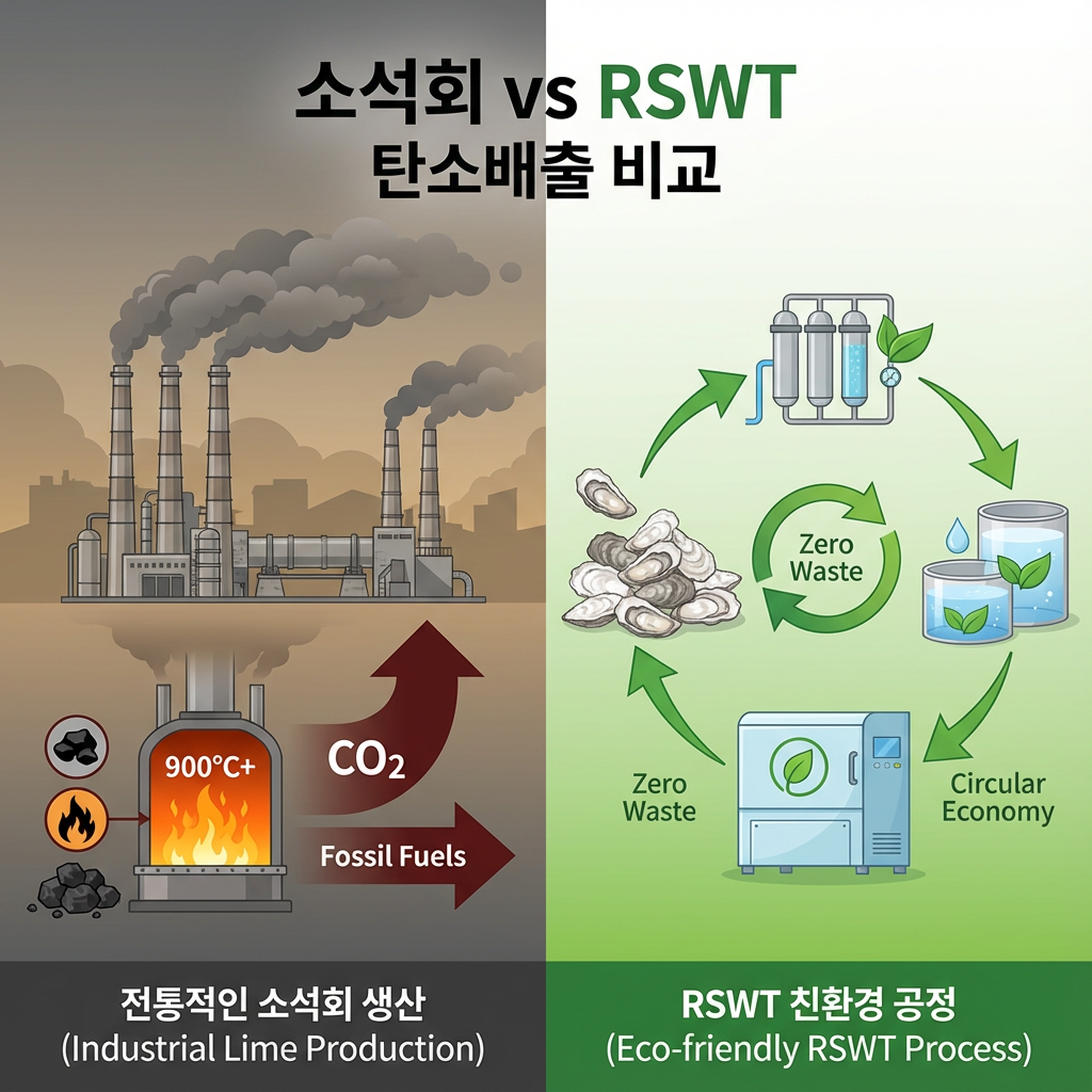 핵심은 '제로 직접배출'입니다. 소석회처럼 석회석을 분해하는 과정이 없어 화학 반응에서 CO2가 발생하지 않습니다.