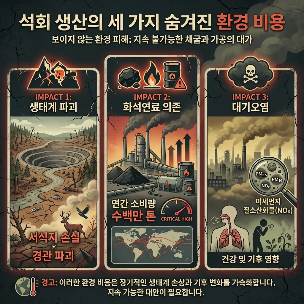 - 석회석 채굴: 산과 자연 생태계를 파괴하며 원료 확보