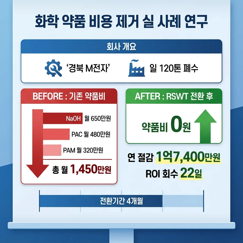 경북 M전자(일 폐수 120톤)는 월 1,450만 원의 약품비를 부담하던 기업입니다.
