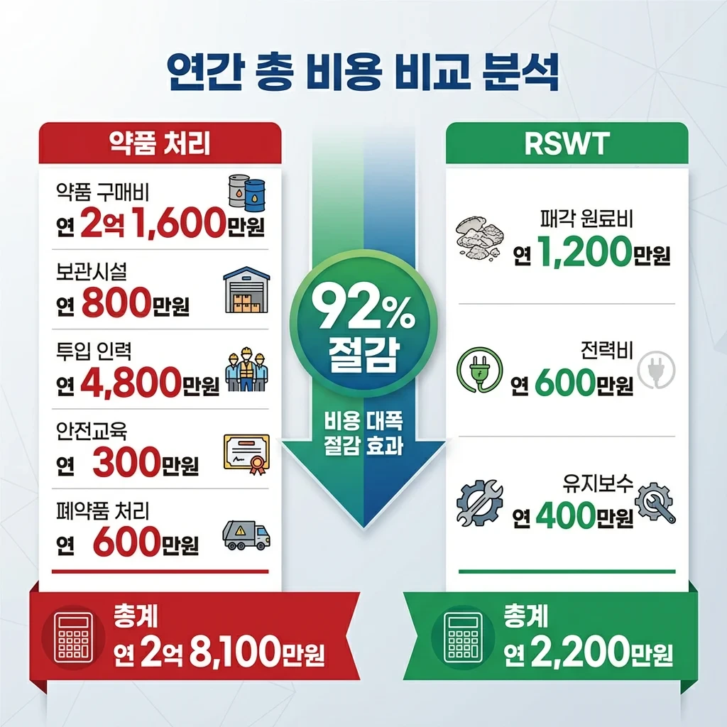 추가 약품 제로. 운영 인력 최소화. 안전 위험 제로.