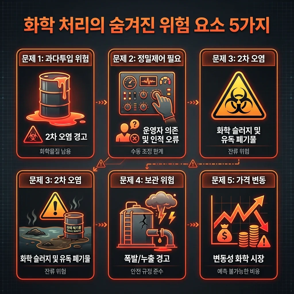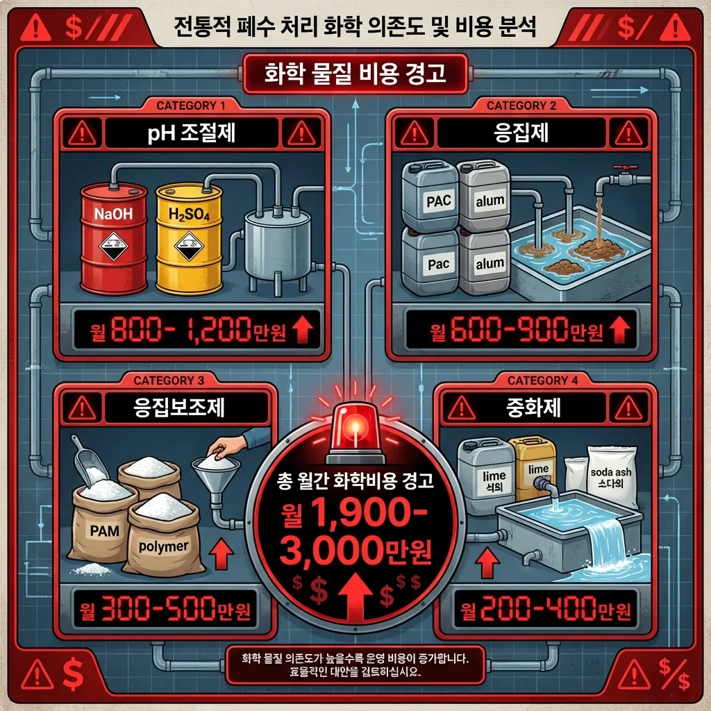 약품 의존 폐수처리는 끝없는 비용 소모와 안전 위험의 굴레입니다.