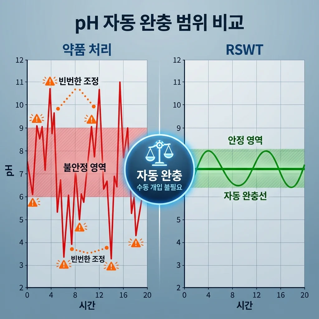RSWT는 탄산칼슘의 자동 완충 반응으로 이 모든 문제를 한 번에 해결합니다.
