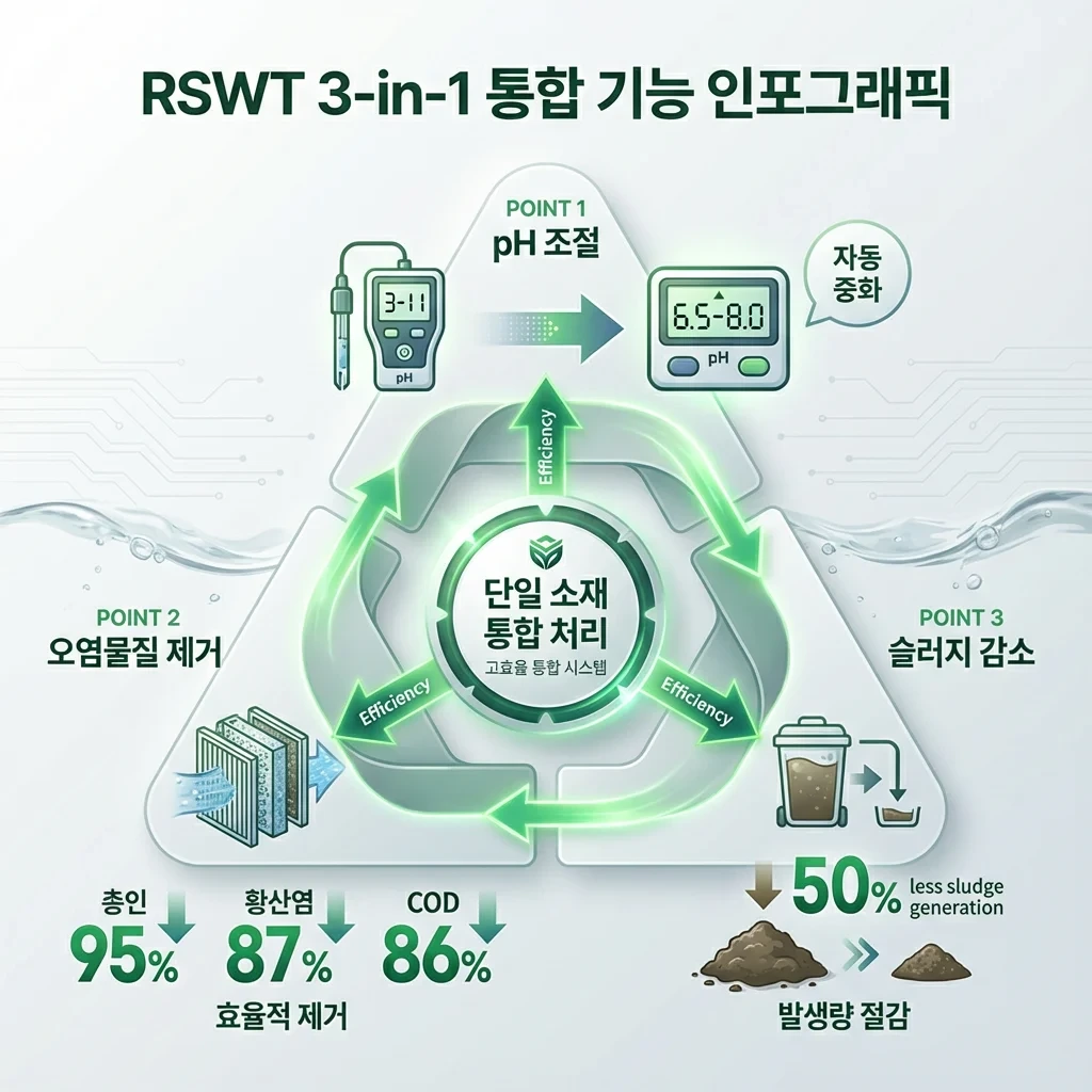 하나의 소재가 pH 조절, 오염물질 제거, 슬러지 감소를 동시에 수행합니다.