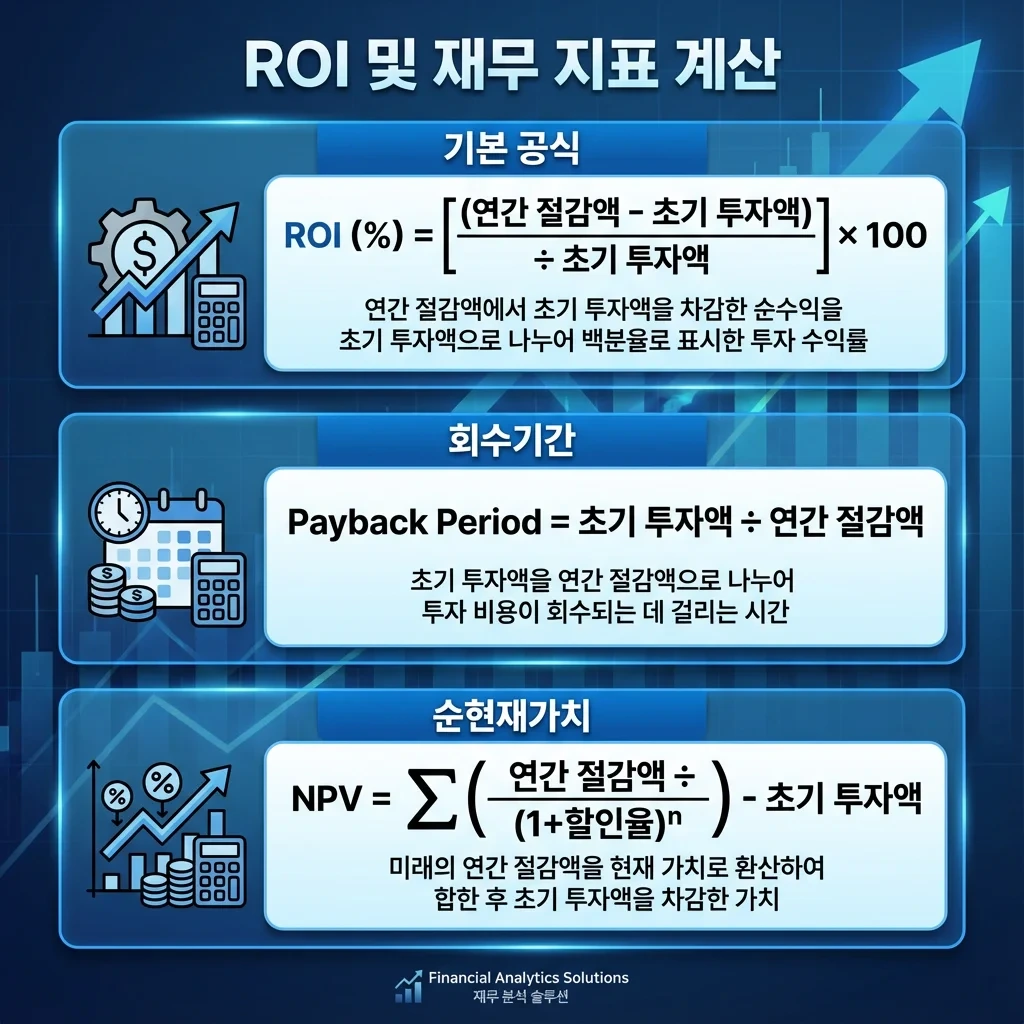 ROI (%) = [(연간 절감액 - 초기 투자액) ÷ 초기 투자액] × 100